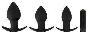 Σετ βύσματος βουτιάς από τα μαύρα Velvets με 3 πρωκτικά βύσματα και 1 vibro-bullet για εισαγωγή. Τα πρωκτικά βύσματα έρχονται σε διαφορετικά μεγέθη και βάρη και είναι απόλυτα κατάλληλα για εκπαίδευση διατάσεων 3 βημάτων. Κάθε κωνικά διαμορφωμένο βύσμα είναι εξοπλισμένο με μια απαλή άκρη και ασφαλές πώμα. Επιπλέον, είναι ευχάριστα εύκαμπτα και κατασκευασμένα από σιλικόνη με υφή με μαλακό Touch για εύκολη εισαγωγή και άνετες διατάσεις. Το ισχυρό vibro-bullet ταιριάζει και στα τρία βύσματα και μπορεί εύκολα να εισαχθεί στο επιθυμητό βύσμα. Δέκα διαφορετικές λειτουργίες δόνησης παρακαλώ την πίσω πόρτα και μπορούν να ελεγχθούν με ένα κουμπί στη σφαίρα. Το ιβρο-μπουλέ είναι επαναφορτιζόμενο και ένας μαγνητικός φορτιστής USB περιλαμβάνεται.